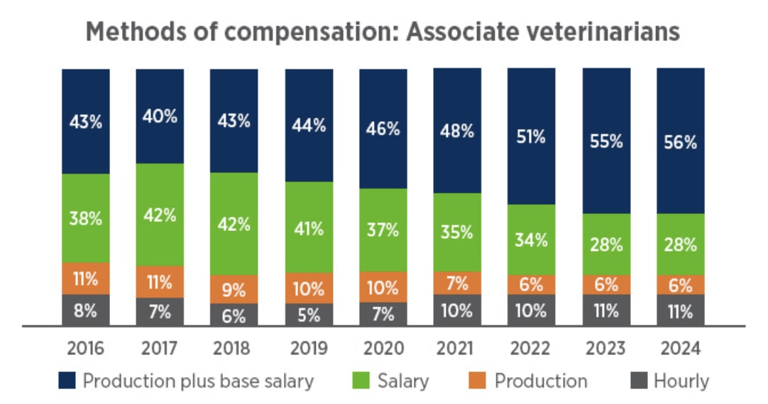 As this month’s chart shows, compensation based on production plus base salary (also known as ProSal) has gained in popularity since 2016, with more than half (56%) of associate veterinarians paid this way in 2024. On the other hand, compensation by salary or production alone has become less common.