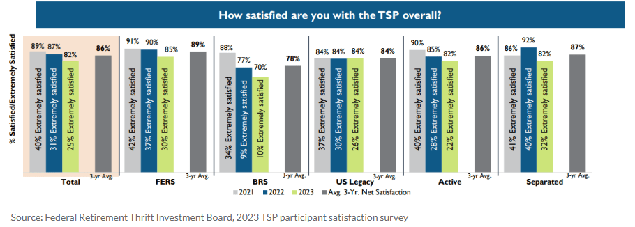 Currently, 82% of TSP participants are satisfied with the plan, compared with an 87% satisfaction rate in 2022, the board’s survey of tens of thousands of TSP participants showed.
