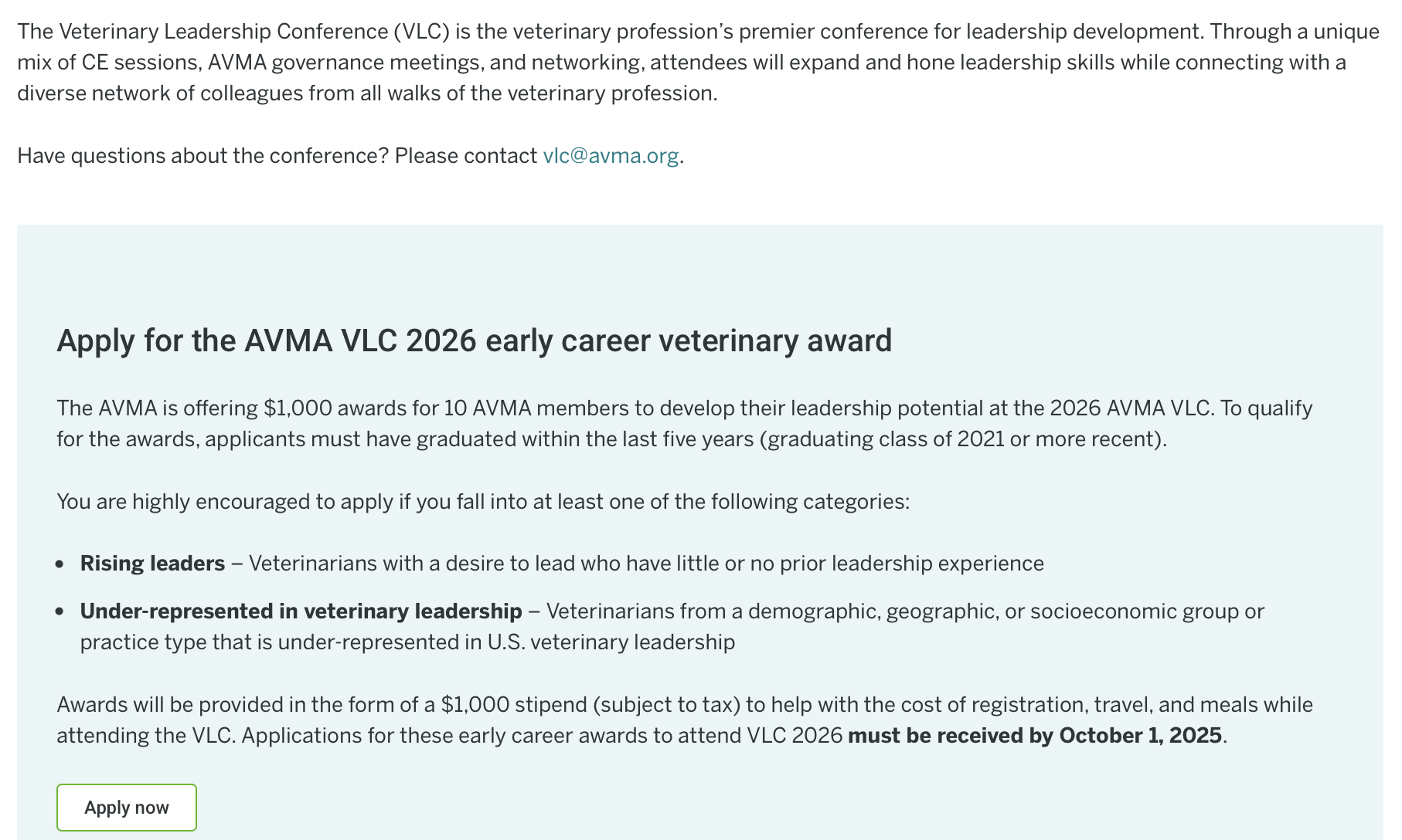 Visionary leadership for veterinary professionals Back to News Items Visionary leadership for veterinary professionals By Joseph Annelli 9/21/2025 AVMA Activities News Organizational News By AVMA Source here: https://www.avma.org/events/veterinary-leadership-conference Images × Share × Email Facebook LinkedIn X Pinterest Powered By GrowthZone