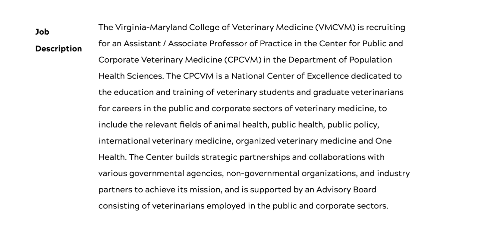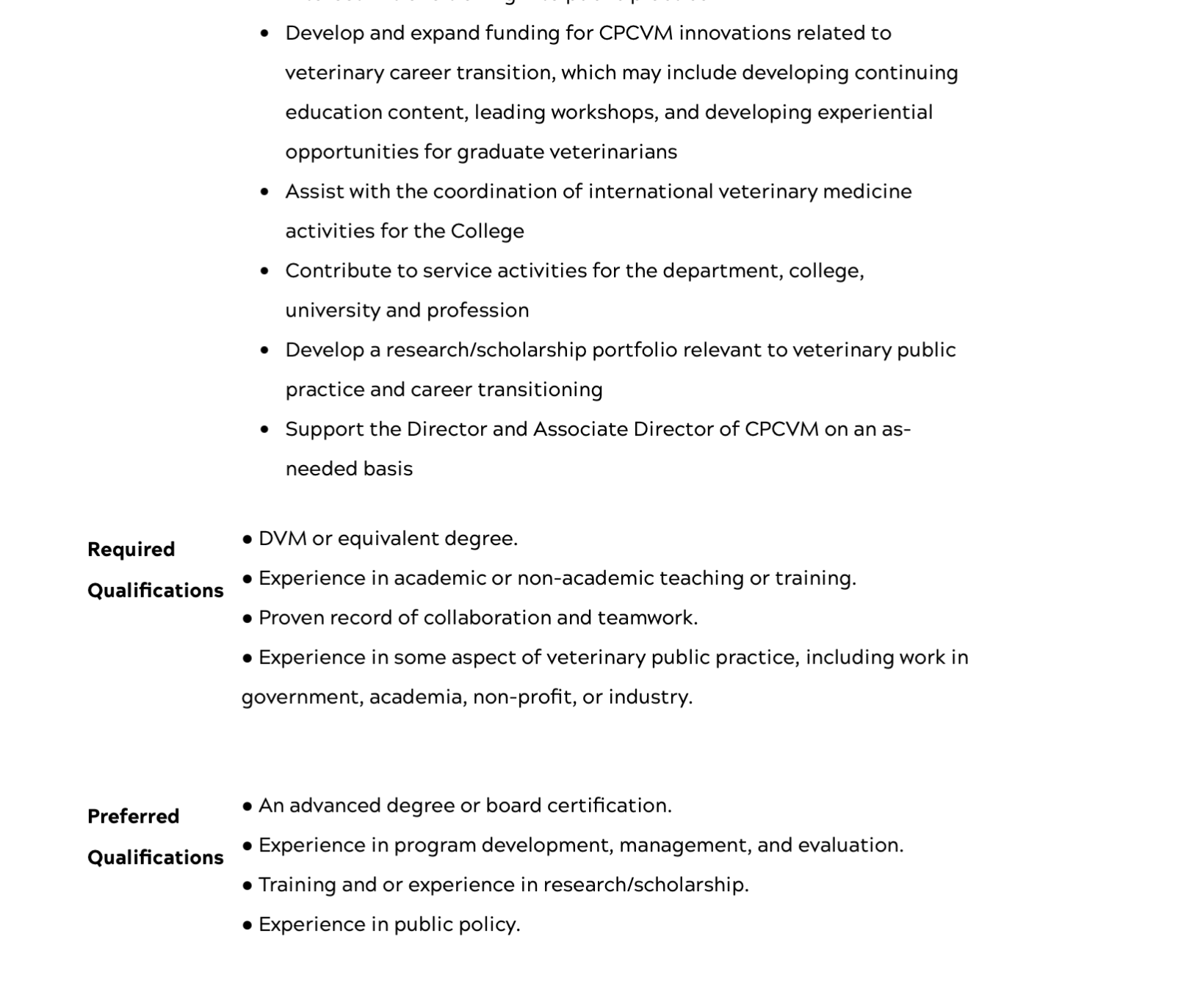 Asst/Assoc Prof of Practice, Center for Public and Corporate Veterinary Medicine Back to Public Practice Veterinary Jobs Asst/Assoc Prof of Practice, Center for Public and Corporate Veterinary Medicine By Joseph Annelli 5/16/2025 Job no: 528158 Images × Share × Email Facebook LinkedIn X Pinterest Powered By GrowthZone