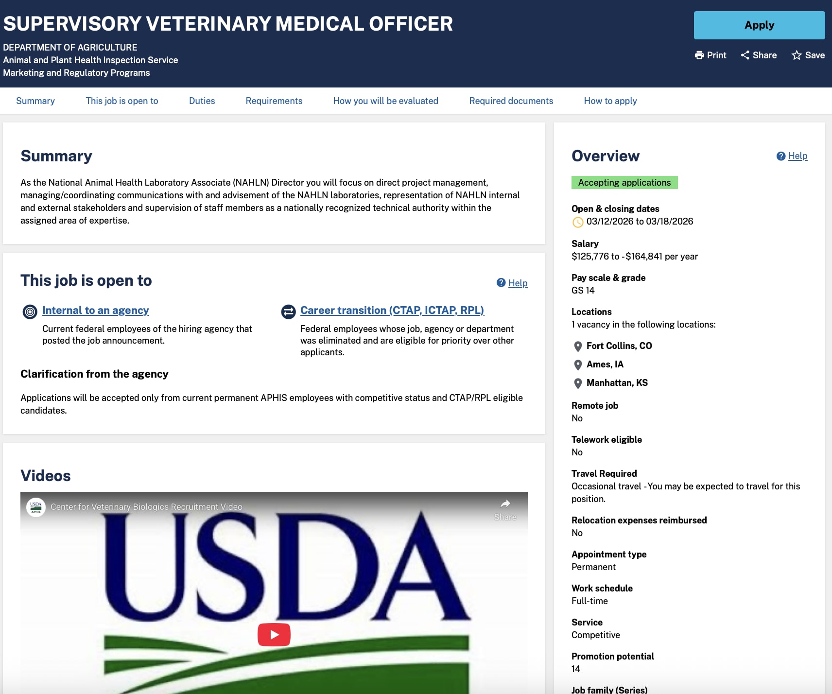 Supervisory Veterinary Medical Officer Back to Public Practice Veterinary Jobs Supervisory Veterinary Medical Officer By Joseph Annelli 3/12/2026 Images × Share × Email Facebook LinkedIn X Pinterest Powered By GrowthZone